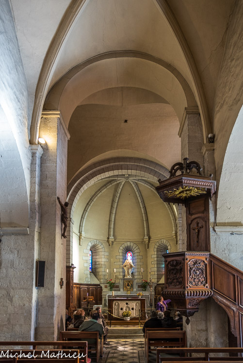 A l’est, un ensemble roman très intéressant constitué par un transept voûté en berceau sur arcs doubleaux auquel sont accolés un chevet pentagonal et une absidiole voûtés sur branches d'ogives qui semblent remonter au début du XIIIe siècle.