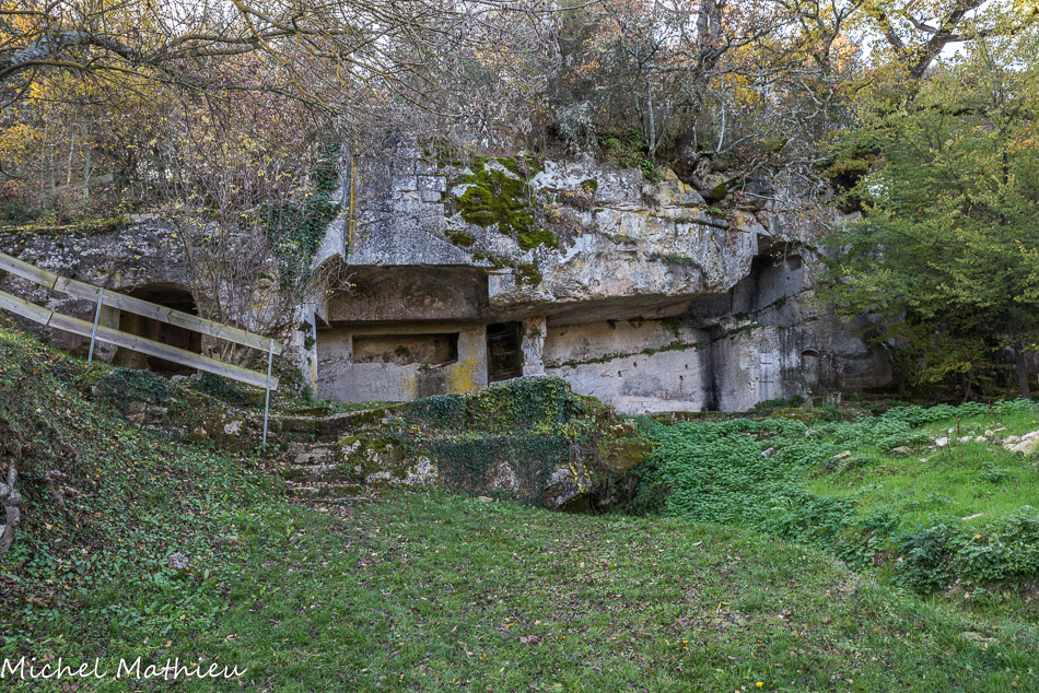 Vue générale des aménagements troglodytiques. Au centre, la chambre funéraire qui s’ouvre au coin N.O. de l’église Saint-Jean-Baptiste. A droite, un appentis couvrant un espace ayant servi de carrière de pierres. Au pied des rochers, la source sacrée de Carluc. La charte de 1011 est le premier texte connu qui cite Saint Pierre de Carluc, ainsi qu'Archinric, qui fut abbé de Montmajour quelques années plus tôt. Il existe donc à cette date un prieuré à Carluc. La charte fait état d'un legs à Estoublon fait « à l'abbé Archinric, à ses successeurs et à ses moines, à Saint-Pierre de Carluc, ainsi qu'aux moines qui résideront dans le monastère à construire ».