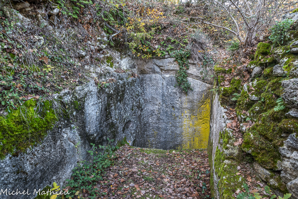 Prieuré de Carluc La chambre funéraire vue du dessus, avec la rainure cintrée où s’encastrait la voûte qui la recouvrait.