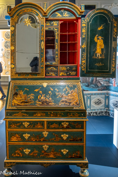 L’ensemble de la surface vernissée figure un décor de chinoiseries : à l’intérieur des vantaux, se tiennent deux Chinois stéréotypés, tandis que des motifs de maisons pittoresques sont représentés sur l’abattant du bureau. Si la nature de la laque reste à définir, cette couleur bleue, inconnue en Asie avant le XIXe siècle, est en revanche très usitée dans l’Angleterre du XVIIIe siècle. L’ensemble de ces caractéristiques nous autorise à penser qu’il s’agit certainement d’une fabrication anglaise.