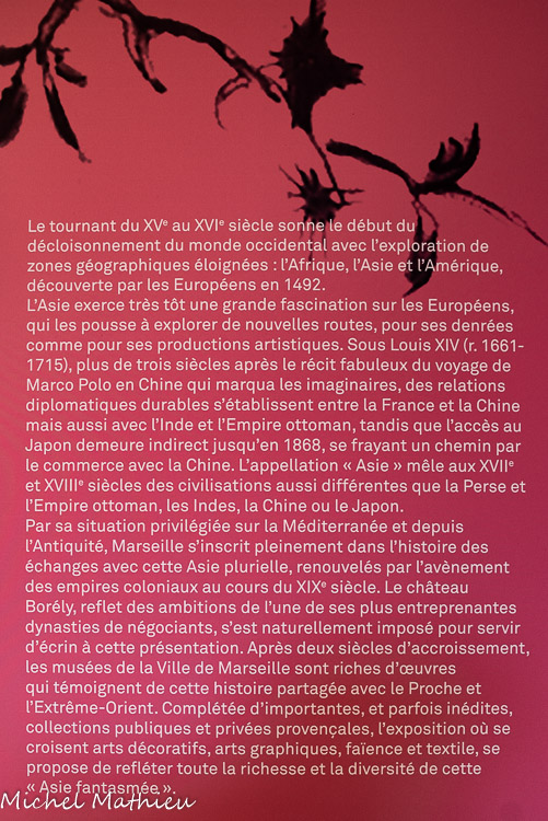 Par sa situation privilégiée sur la Méditerranée et depuis l’Antiquité, Marseille s’inscrit pleinement dans l’histoire des échanges avec cette Asie plurielle, renouvelés par l’avènement des empires coloniaux au cours du XIXe siècle. Le château Borély, reflet des ambitions de l’une de ses plus entreprenantes dynasties de négociants, s’est naturellement imposé pour servir d’écrin à cette présentation. Après deux siècles d’accroissement, les musées de la Ville de Marseille sont riches d’œuvres qui témoignent de cette histoire partagée avec le Proche et l’Extrême-Orient. Complétée d’importantes, et parfois inédites, collections publiques et privées provençales, l’exposition où se croisent arts décoratifs, arts graphiques, faïence et textile, se propose de refléter toute la richesse et la diversité de cette « Asie fantasmée ».