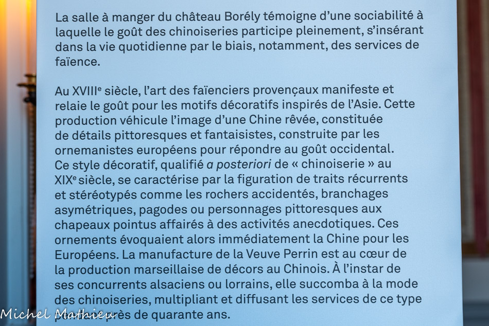 Le parcours de l’exposition invite à une appréhension transversale de « l’Asie fantasmée » en offrant des approches diverses des œuvres présentées ; un parti- pris conforté par les contraintes architecturales du château Borély, bâtiment du XVIIIe siècle à l’espace intérieur fr