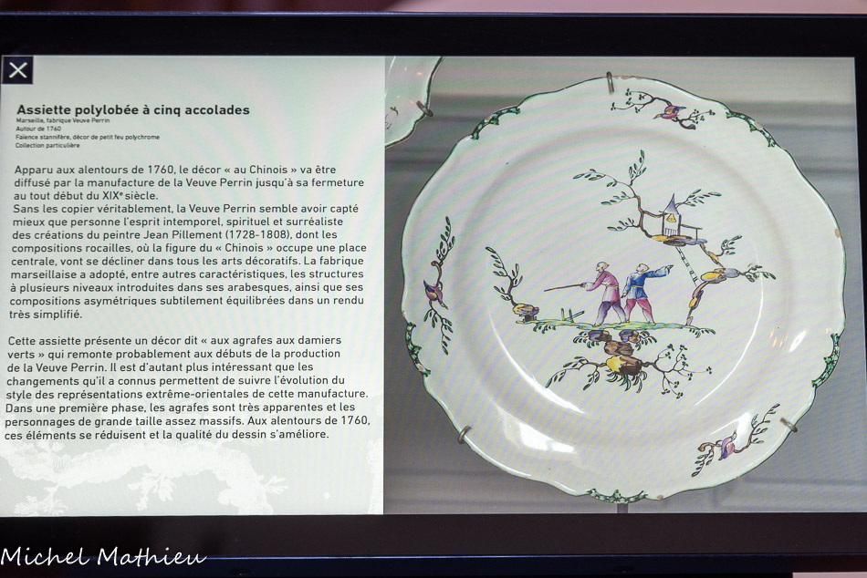 C’est vers 1730 qu’apparaissent à Marseille les premières pièces à décor de Chinois en camaïeu de bleu de grand feu sur fond blanc ou parfois légèrement bleuté. Ces décors, souvent exubérants, sont dénommés aux Chinois-fleurs ou aux Chinois-grotesques.