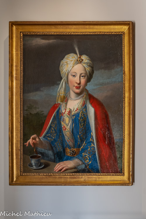 La femme recluse et le café figurent parmi les thèmes les plus populaires de la représentation du monde ottoman dans l’imaginaire européen des Lumières. Dans l’esprit de la peinture galante du temps, le peintre s’est attaché à rendre une vision séduisante du luxe ottoman : habits brodés d’or, bijoux précieux, tasse chinoise évoquant l’importation ou l’imitation des productions de la porcelaine « bleu et blanc » des ateliers de Jingdezhen (Chine).