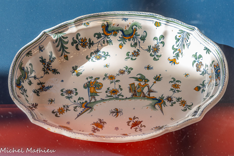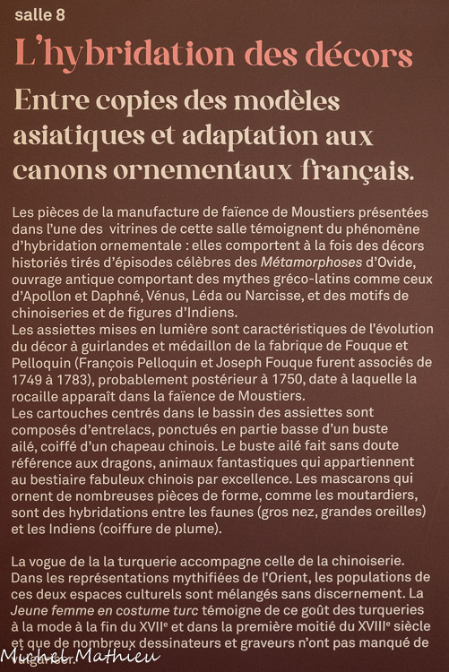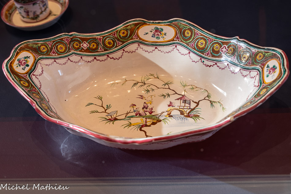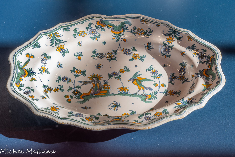 C’est seulement au milieu des années 1730 que, tenant compte d’un regain d’intérêt pour les chinoiseries, Pierre II Clérlssy, devenu le directeur de la manufacture familiale de Moustiers en 1736, utilisa les figures de Chinois pour diversifier ses décors. Rebord en camaïeu bleu, elles devinrent polychromes pour disparaître au début des années 1740, remplacées par les grotesques d’Olérys, décor où l’exotisme n’est pas totalement absent. Elles réapparurent dans la seconde partie du siècle, surtout avec l’avènement du petit feu.