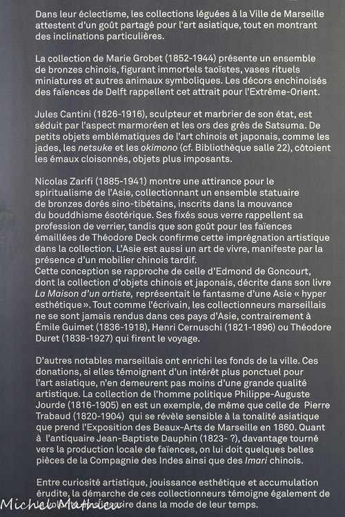 N’échappant pas à ce phénomène, la Provence voit ses manufactures de faïence adopter les ornements chinois ou japonais, ses ateliers de textiles imiter les cotonnades d’Inde ou ses artistes représenter un ailleurs asiatique, propice à toutes les inventions. A Marseille, au XIXe siècle, de grandes figures d’amateurs et collectionneurs d’art asiatique émergent, tels que Nicolas Zarifi, Marie Grobet ou Jules Cantini qui vont considérablement enrichir les collections des musées de la ville.