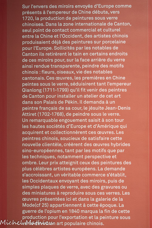 Le papier peint ici reproduit tapisse encore l’ancien salon chinois de la bastide de la Mignarde à Aix-en-Provence. Acquis par Joseph- Sauveur Mignard, ces lés de papier polychromes, importés de Chine et destinés à la clientèle européenne, ont été assemblés dans cette pièce avant la Révolution, sans doute vers 1780. Coûteux, ils étaient prisés par les élites et pouvaient être également déclinés sursoie peinte. Narratif, leur programme représente, par un pêle-mêle de scènes animées de personnages aux traits individualisés, trois secteurs d’excellence qui incarnent le dynamisme économique de l’empire de Chine : la culture du riz, le commerce de la soie et la fabrication de la porcelaine.
