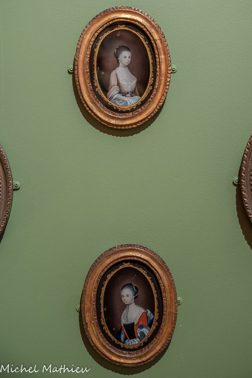 Sur ces deux tableaux, le même visage (ou celui de jumelle ?) est peint en position inversée (en miroir). Les boucles d'oreilles et la coiffure sont identiques et permettent de dater les œuvres du XVIIIe siècle, avant 1780. Las costumes sont différents, mais toujours de la même époque : la forme du décolleté, les manches et le cordon noir noué autour du cou en témoignent. Nous sommes devant des « montages » réalisés en deux parties distinctes : la tête et le buste. La tête est réalisée d'après une miniature apportée à Canton par un Occidental. Ce dernier, en commandant le ou les portraits dans l’atelier chinois, s’était vu proposer par l’artiste chinois plusieurs modèles de bustes à la mode qu’il avait peints précédemment en vue de futures commandes.