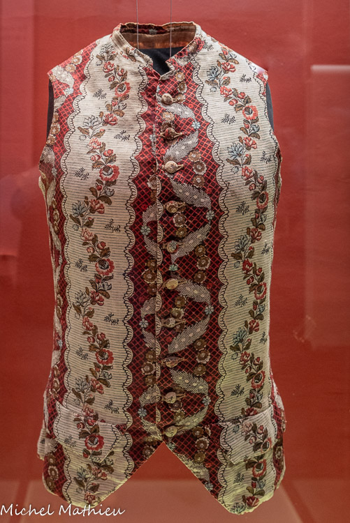 Elément constitutif de l’habit masculin à partir de 1740, le gilet est porté par toutes les classes sociales ; la différence se situe dans la qualité des matières : soie ou coton brodés, indiennes pour les plus fortunés, gros drap sombre pour les plus modestes. Les élégants peuvent en posséder plusieurs centaines dont les décors s’inspirent des tendances du moment et de l’actualité. Non visible, le dos est généralement coupé dans une étoffe de moindre qualité que le devant.