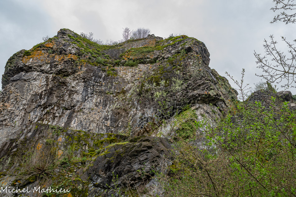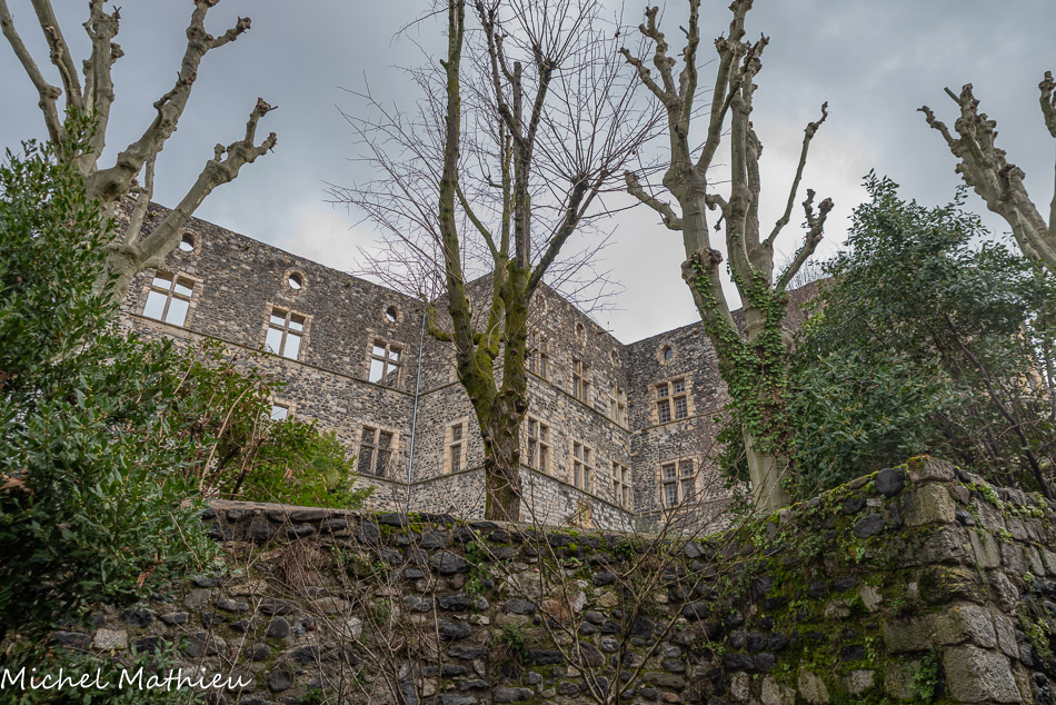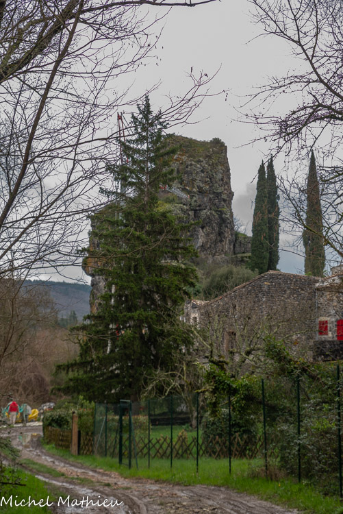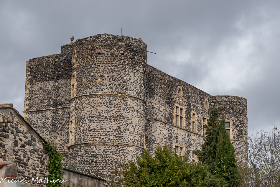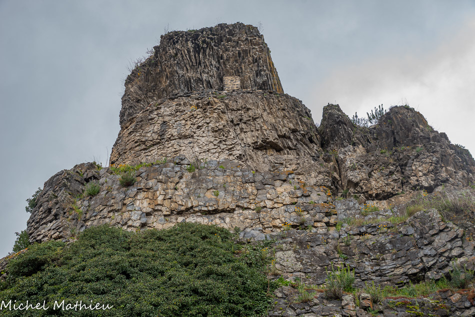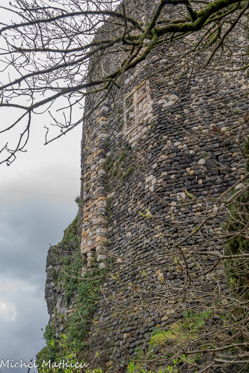 Le donjon primitif se laisse deviner par quelques murs implantés au sommet du neck volcanique autour duquel s’est regroupé l’habitat (le roc St Jean).