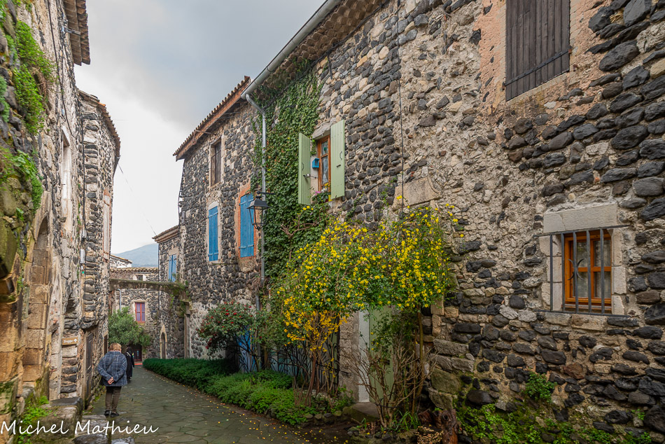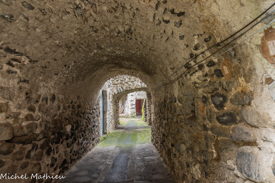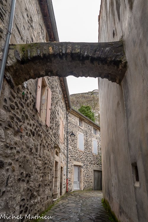 Rue du Four. Le bourg médiéval s’est construit en arc de cercle autour du château érigé sur un neck volcanique. Il se parcourt par un réseau de ruelles dallées.