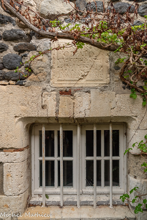 Rue du Four. Maison typique qui correspond à une parcelle. Ele est en pierres de basalte. Les linteaux sont en calcaire. L’ensemble des maisons visibles actuellement datent pour la plupart du XVIème-XVIIème s. à quelques exceptions près (maisons du XIVe et XVe s.). L’architecture reste similaire pour l’ensemble des constructions : un comble (grenier) sous les toits, une pièce à l’étage qui sert de logement et à laquelle on accède par un escalier intérieur ou extérieur comme ici et une pièce voûtée au rez-de-chaussée appelée « la crotte » qui sert de boutique, d’atelier, de cave ou d’étable d’où son nom. L'escalier était à l'extérieur pour gagner de l'espace à l'intérieur.