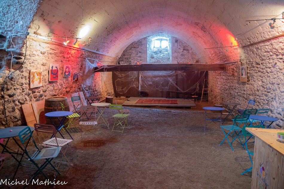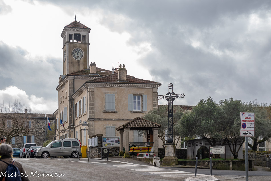 Au fond, le Coiron d'où provient le basalte qui a servi à la construction des bâtiments. Le massif du Coiron est l’exemple d’un phénomène géologique appelé « inversion de relief ». Il y a 6 à 8 millions d’années, a lieu une intense activité