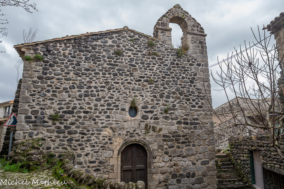 Le clocher mur à 3 ouvertures de l'église saint André. Après l'abandon de la cité romaine, il faut attendre le Moyen-Âge pour trouver mention d'une nouvelle agglomération à l'emplacement du village actuel. Au XIe ou XIIe siècle, un donjon, puis un château fort, furent édifiés sur le neck qui porte le château actuel. Des maisons commencèrent à se grouper à son pied, amorce d'un village castral.