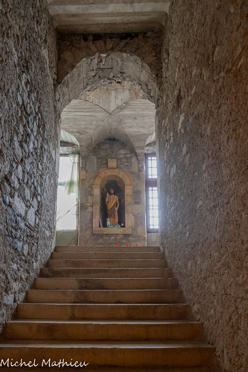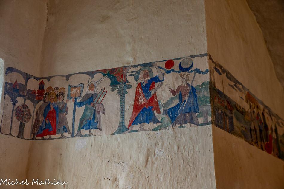 Eglise saint André. Cette échauguette a été tronquée à la suite de la réfection de la toiture. Les maîtres d’œuvre, maçons du pays, avaient reçus l’autorisation de prélever des pierres en calcaire taillé, dans les ruines autour de St Pierre. Ils les ont remployées en parement sur toute une partie de la façade méridionale et dans le clocher.