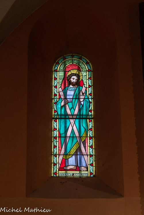 Eglise saint André. Sa particularité c’est qu’elle est adossée au mur d’enceinte taluté des fortifications du XVe siècle, qui était renforcé à l’angle sud-est d’un élément de défense : une échauguette dont on voit encore la base.