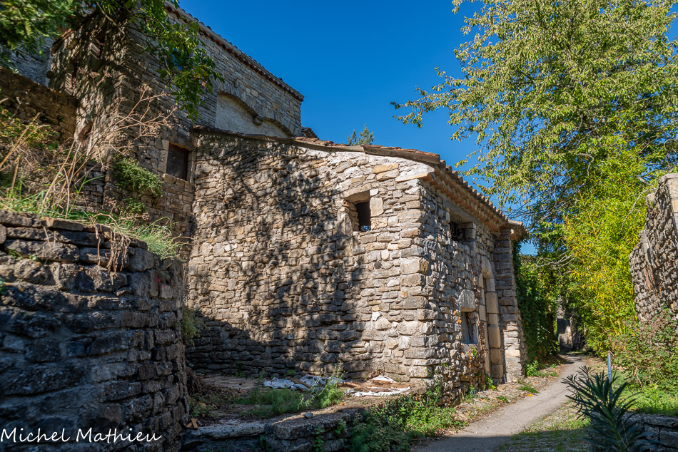 La partie occidentale, c’est-à-dire l’ancienne nef, forme le chœur du sanctuaire actuel ; elle est couverte d’une voûte d’arêtes de facture très rustique et a conservé une belle fenêtre romane malheureusement obturée par la construction d’une sacristie au XIXe siècle. L’ancienne abside, à l’est ( à droite), a été décorée d’une très belle croisée d’ogives, car elle est devenue la chapelle funéraire de la famille de Vogüé dont le caveau est creusé dans le roc. On lit sur la dalle : « Ici reposent Jean de Vogüé mort en 1552 et son fils Guillaume en 1602, précédés de douze générations de chevaliers », ce qui ferait remonter au début du XIIIee siècle l'origine de la famille. Guillaume joua un rôle très important en Vivarais au cours de la seconde moitié du XVIe siècle et son petit-fils Balthazar fut même Chevalier de l'Ordre de Saint-Jean-de-Jérusalem.