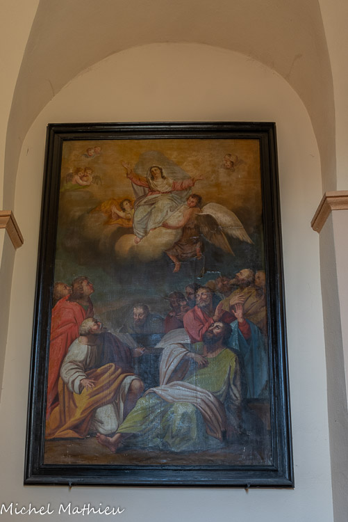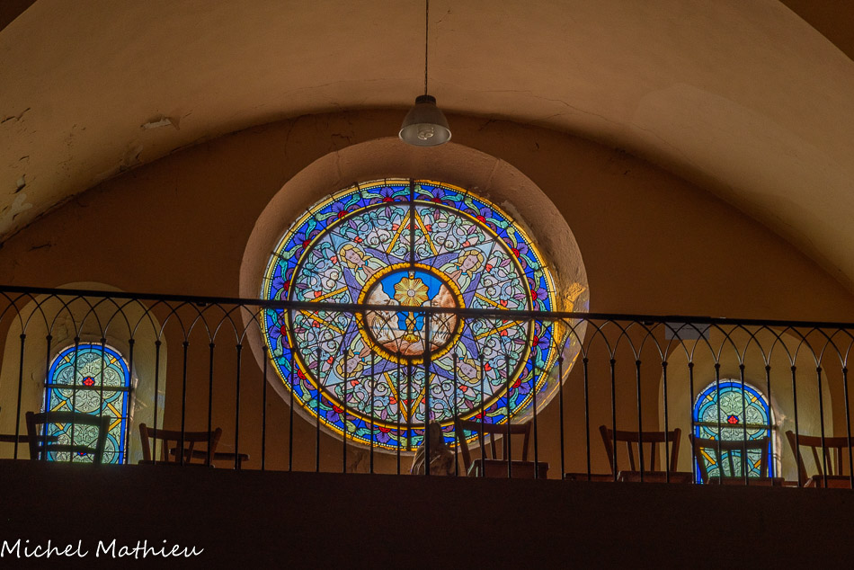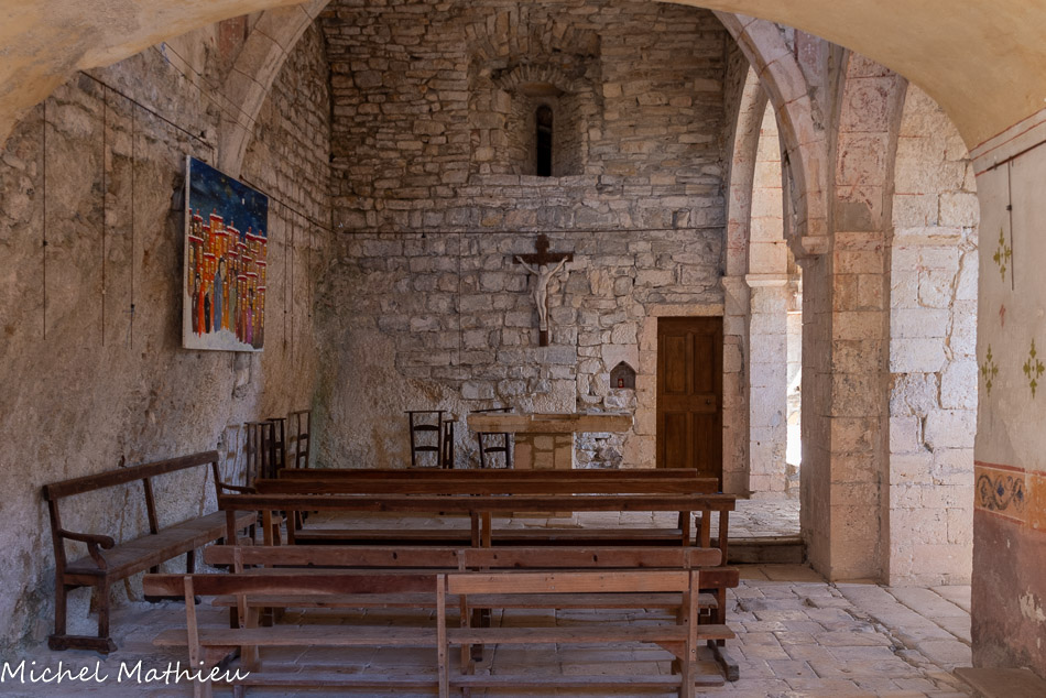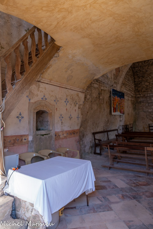 Chœur de la chapelle actuelle, ancienne nef de celle du XIIIe siècle. A droite, l'ouverture du fond ouvre surla chapelle funéraire de la famille de Vogüé, la première ouverture donnant accès à la