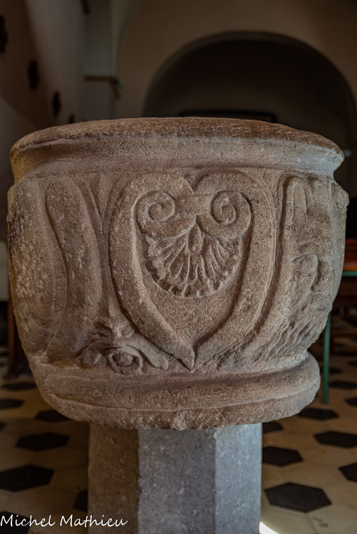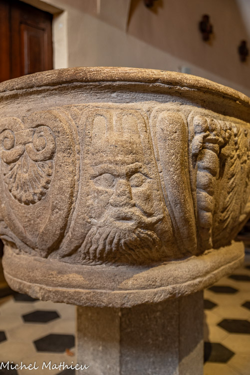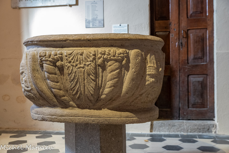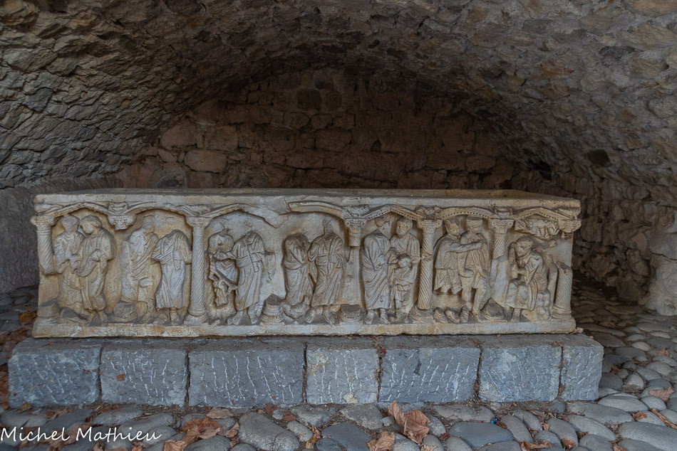 Ce sarcophage de marbre blanc, orné de scènes religieuses, a été découvert au XVIe siècle au hameau des Salles, à deux kilomètres en amont du village, par un agriculteur qui labourait son champ. Sa qualité exceptionnelle indique qu'il s'agit de la sépulture d'un personnage riche et de haut rang. Il est vraisemblablement issu des ateliers d’Arles dont la production de sarcophages au IVe siècle était importante. L'original est conservé au musée gallo-romain de Lyon, on a ici un fac-similé. Les bas-reliefs, malheureusement très abîmés, représentent sept scènes du Nouveau Testament.