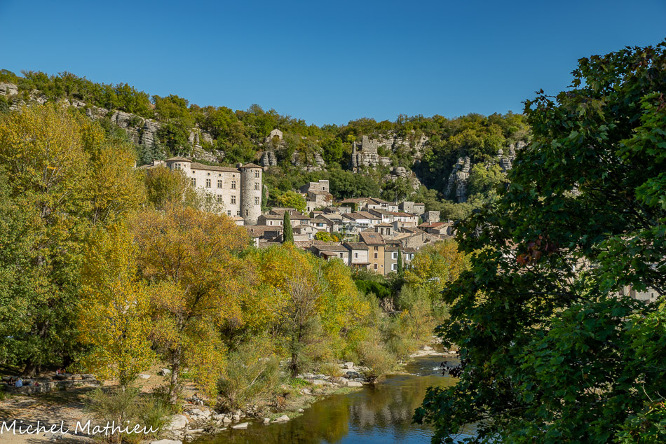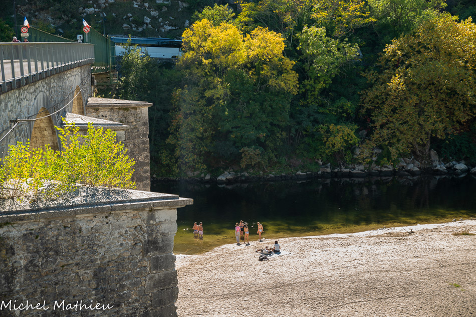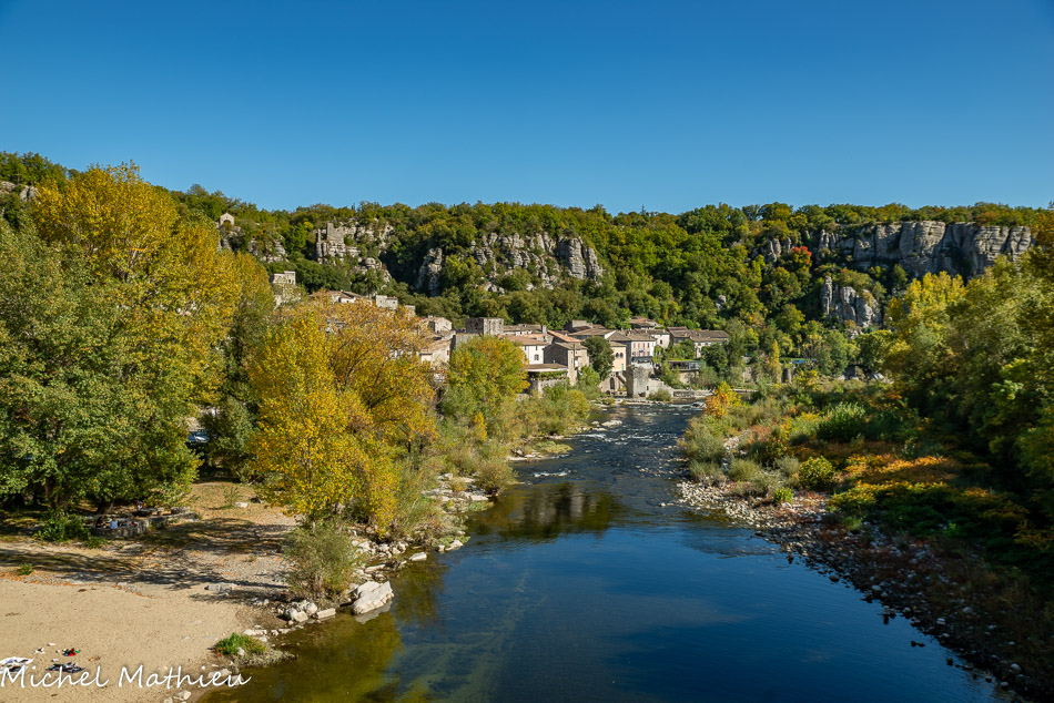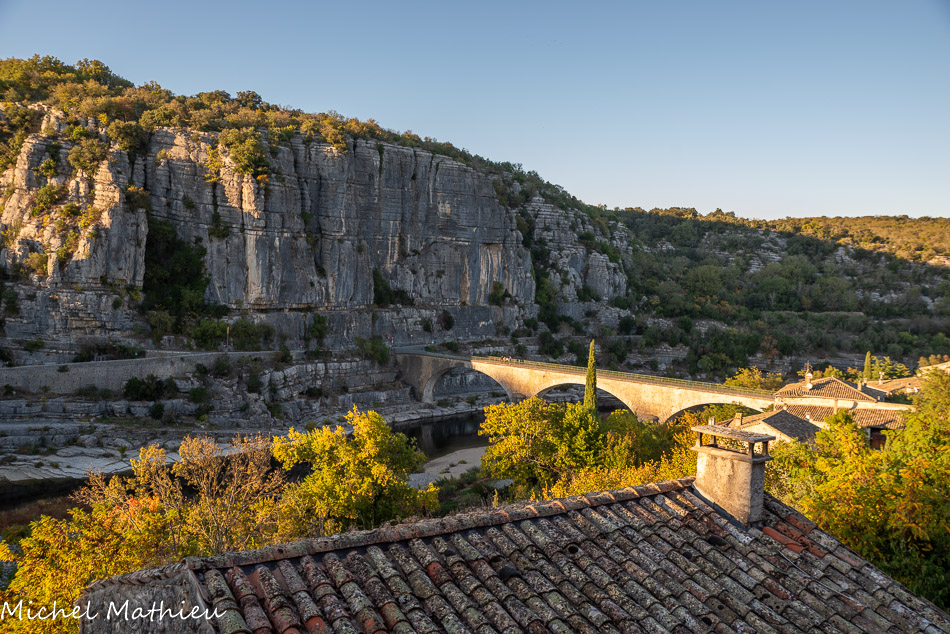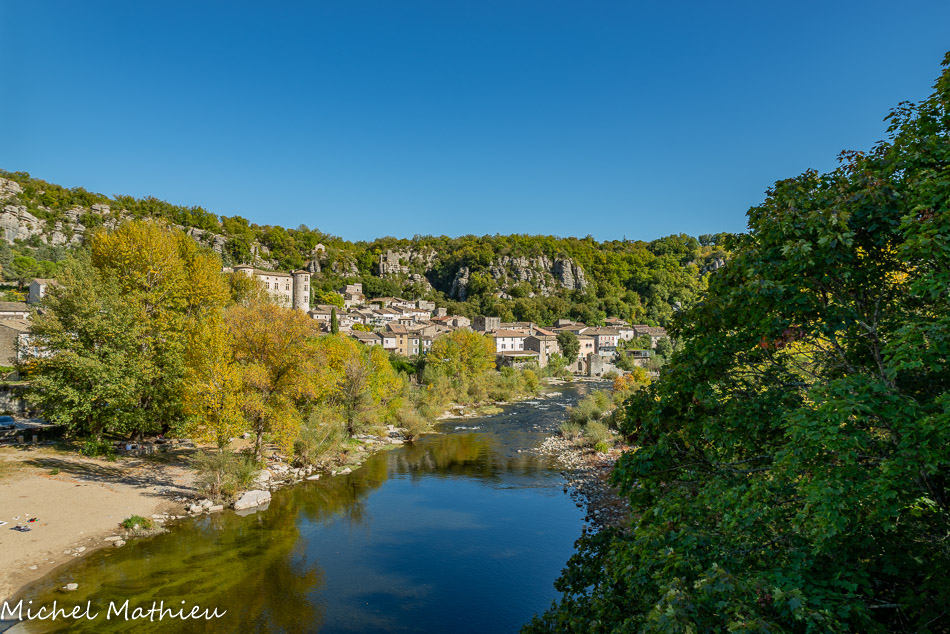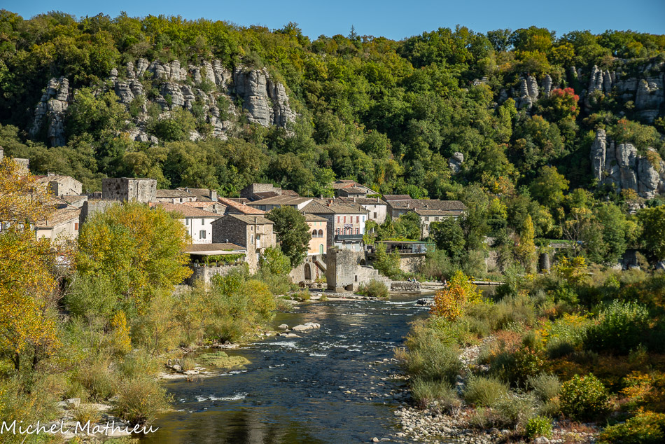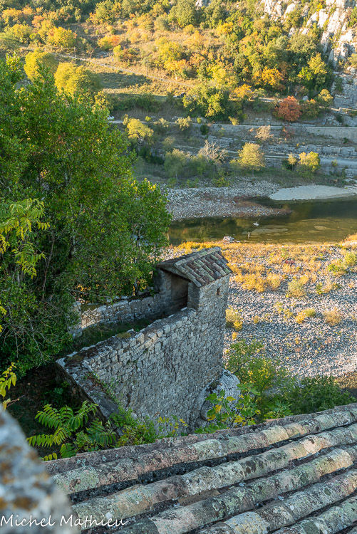 Pont de la route des Gras. Balazuc est accroché aux falaises qui bordent l'Ardèche, dans le Vivarais méridional. Le cours de l'Ardèche forme une frontière naturelle entre la vallée du Rhône et le Massif central. Balazuc s'est installé au niveau d'un passage à gué naturel, longuement emprunté avant d'être supplanté par la traversée en bateau, puis par le pont.