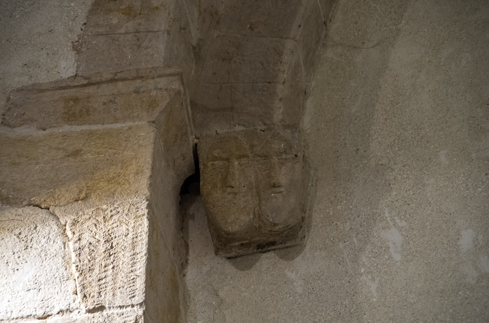 La chapelle Ste Agnès Les chapiteaux qui surmontent ces voussures ou servent de cul-de-lampe aux retombées des arcs, sont sculptés de têtes archaïques (masques humains isolés ou par deux) qui évoquent l'art gaulois.