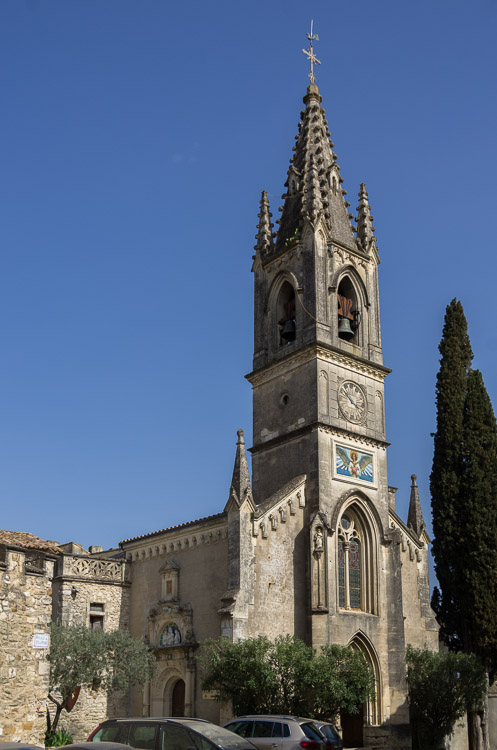 Aiguèze On doit à Mgr Fuzet la rénovation de l'église elle-même, avec des peintures représentant l'art sacré de la fin du XIXe avec l'influence de Violet Leduc, ainsi que la flèche du clocher.