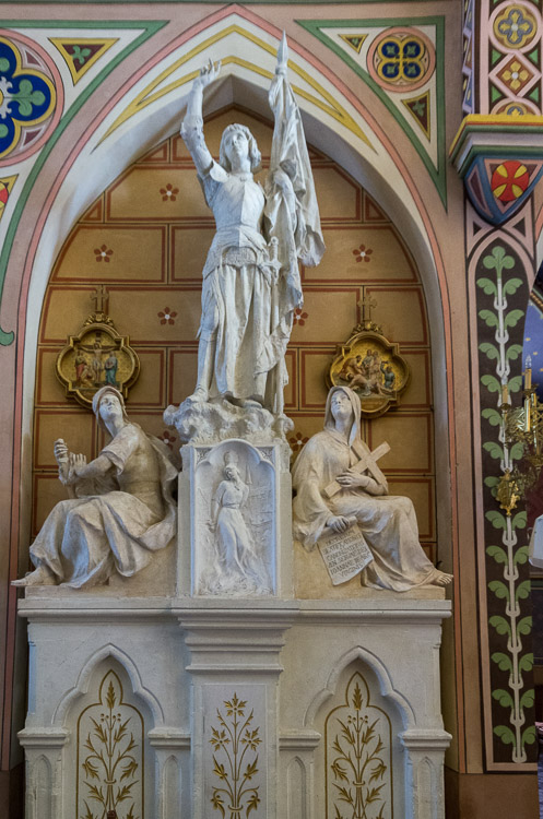 Aiguèze Jeanne d'Arc (béatifiée en 1909, canonisée en 1920) : dans la nef, monument du martyre (copie de celui qui figurait à Rouen place du Vieux Marché) sous la maquette de sa statue par Navone.