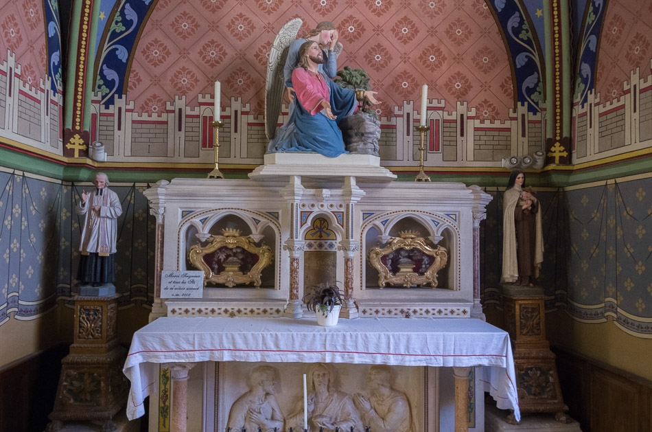Aiguèze La chapelle des fonts baptismaux de 1895. Au-dessus de l'autel la Passion est évoquée avec l'agonie du Christ au jardin des oliviers et en bas-relief la Résurrection symbolisée par les disciples d'Emmaüs.