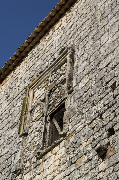 Aiguèze L'Hôpital. Fenêtre à meneaux de forme gothique et pierre qui est l'évacuation de l'eau de l'évier.