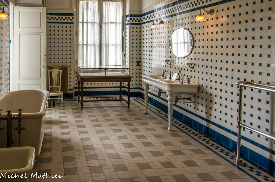 L’office de la salle à manger. C’est dans cet office que le maître d’hôtel reçoit les plats déposés par le cuisinier dans le monte-plat. Un chauffe-plat, qui sert également de chauffe-assiettes, permet de les tenir au chaud si nécessaire. Une glacière, dissimulée dans un des buffets, gardait au froid les sorbets du dessert. Au dessus de l’évier un stérilisateur à ozone permettait de purifier l’eau.