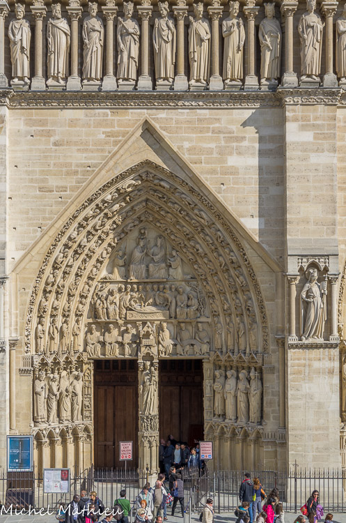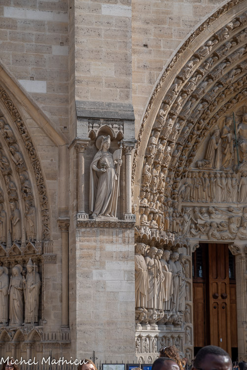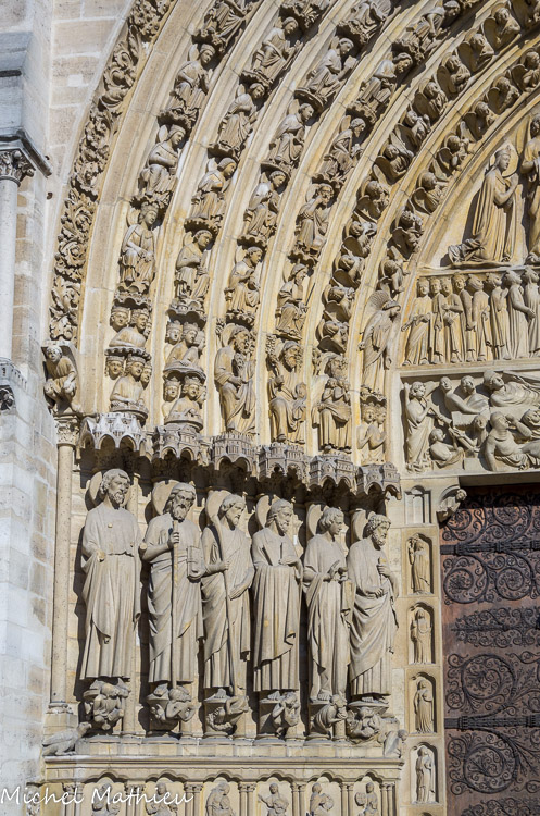 Sur cette façade, 28 statues représentent les rois de Juda et d’israël, ancêtres du Christ. Au-dessus de ces personnages, de part et d’autres de la façade, on trouve les statues d’Adam et Eve. Ces statues ont été refaites par Viollet-le-Duc au XIXe siècle.