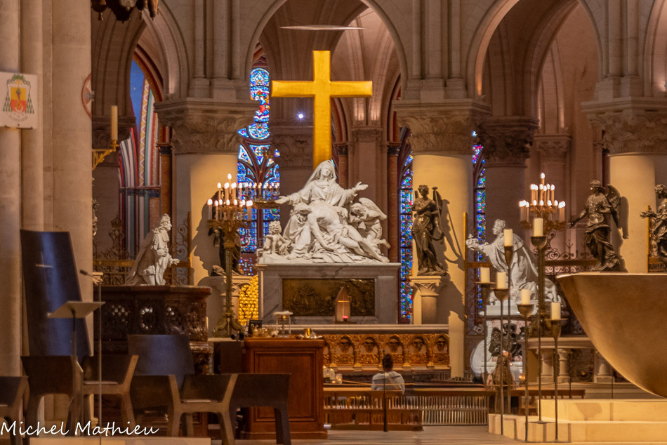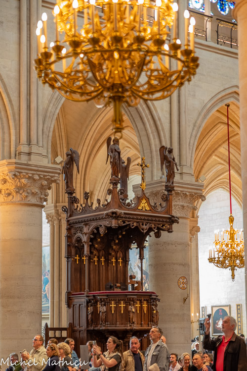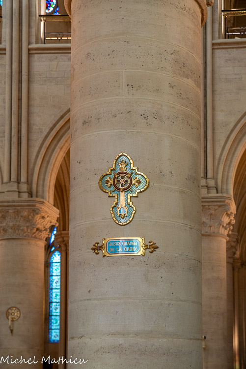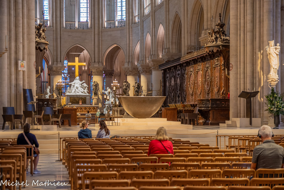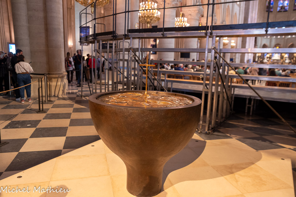 En entrant à nouveau dans Notre-Dame de Paris, par le portail central de la façade occidentale, celui du Jugement dernier, la première étape n’est autre que le baptistère. Conçu par le sculpteur Guillaume Bardet à la demande du diocèse de Paris, il remplace le baptistère mobile utilisé avant l’incendie. Désormais, dès son arrivée, chacun pourra admirer une croix d’or jaillissant des flots du même métal et contenus dans une simple vasque en bronze. Une matière utilisée pour les cinq éléments du mobilier liturgique commandé au même artiste.s.