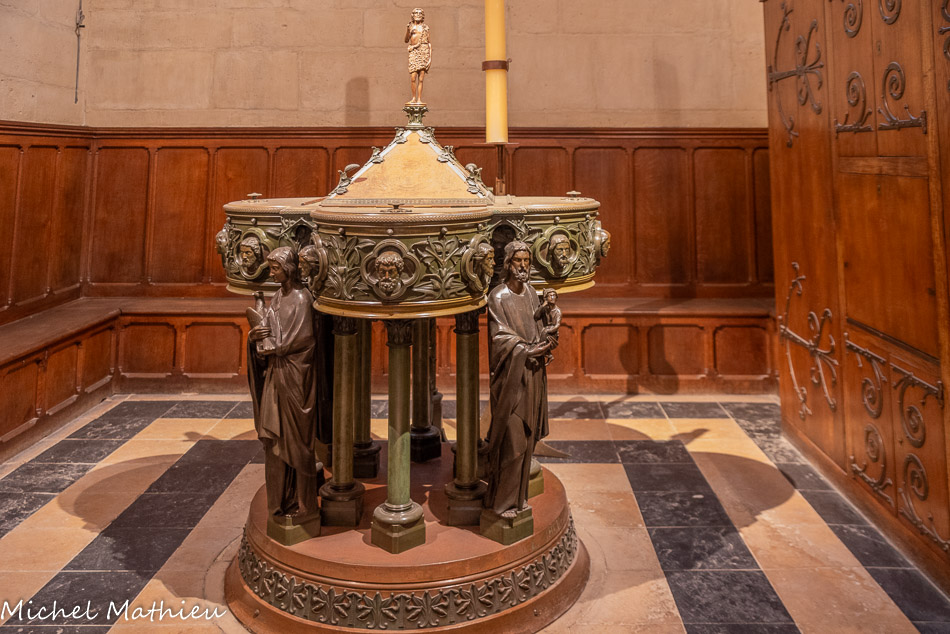 Fonts baptismaux avec statuette de saint Jean-Baptiste, effigies des douze apôtres et statues des quatre évangélistes par Louis Bachelet, bronzier (1860) d'après les dessins d'Eugène-Emmanuel Viollet-le-Duc, architecte.