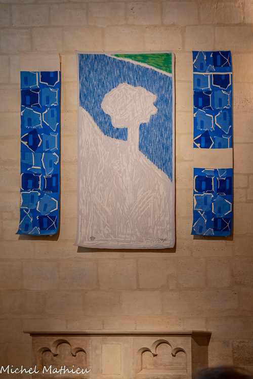 Vitraux du choeur. A gauche , l'Annonciation. Au centre, la Glorification de la Vierge, à droite, la Visitation.