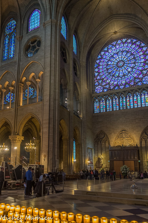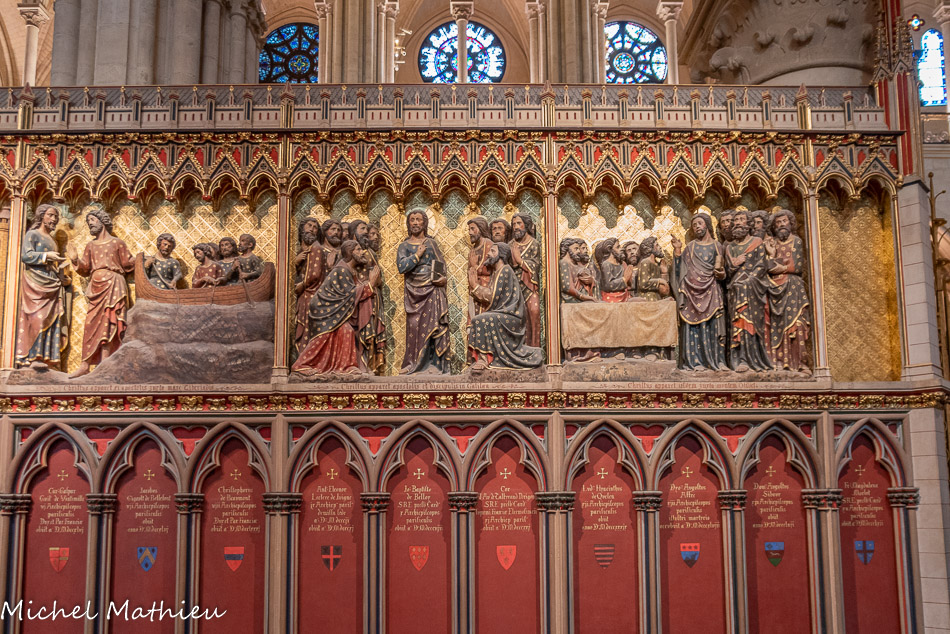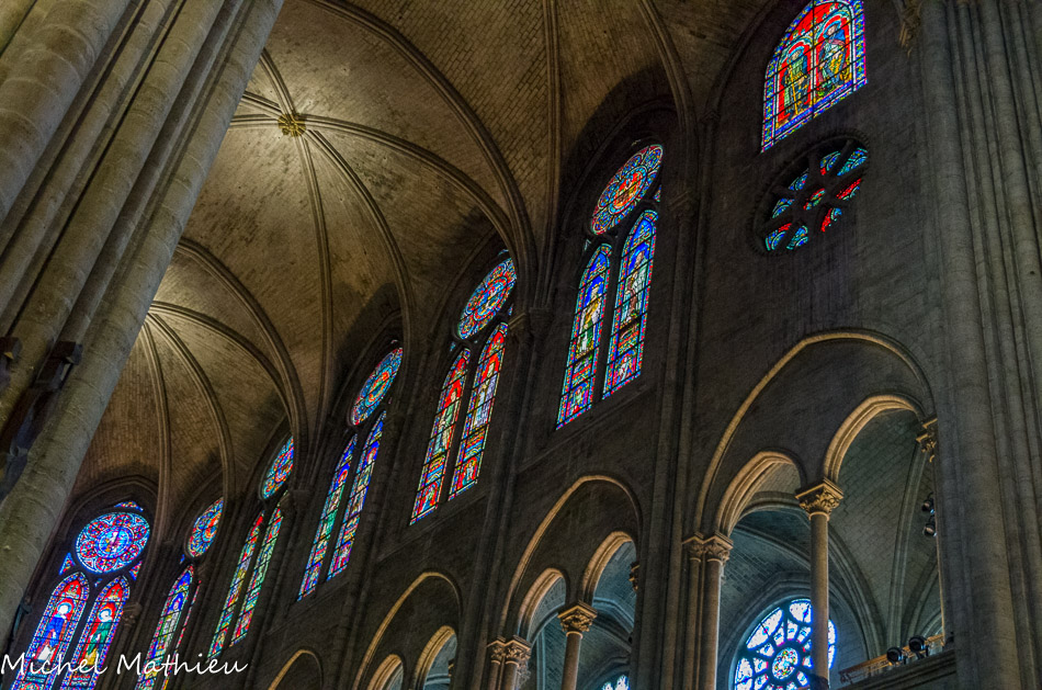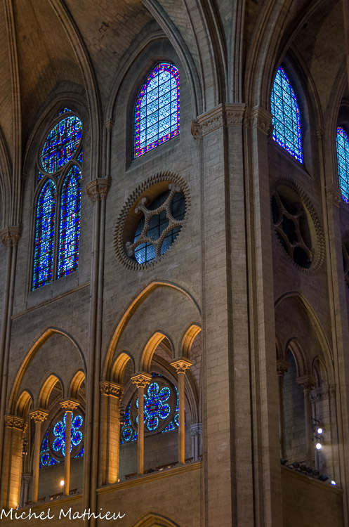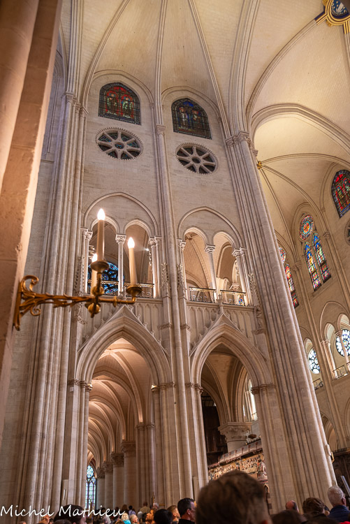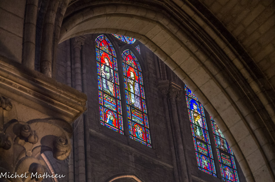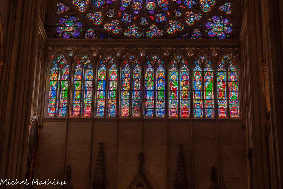 En 1965, les fenêtres hautes de la nef et les roses des tribunes ont enfin été garnies de vitraux colorés remplaçant les verres gris et ternes implantés par les chanoines au XVIIIe siècle. Non figuratifs, ils sont l’œuvre de Jacques Le Chevallier qui a utilisé les produits et couleurs du Moyen Âge. L’ensemble est à dominante rouge et bleue.