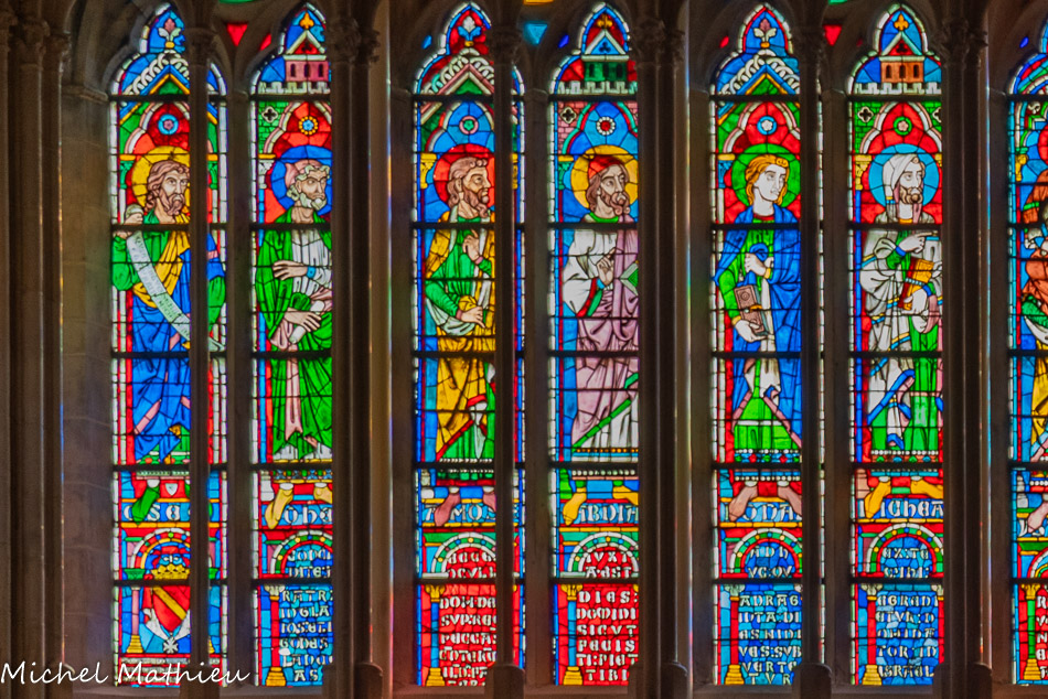 Vue d’ensemble des vitraux de Laurent Charles Maréchal dans les fenêtres hautes du chœur.