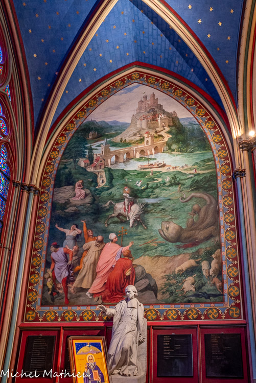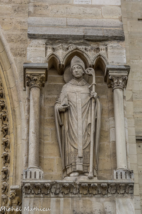 Au trumeau, Saint Marcel, évêque de Paris au Ve siècle, qui écrase un dragon symbolisant les fléaux dont son diocèse était alors affligé.