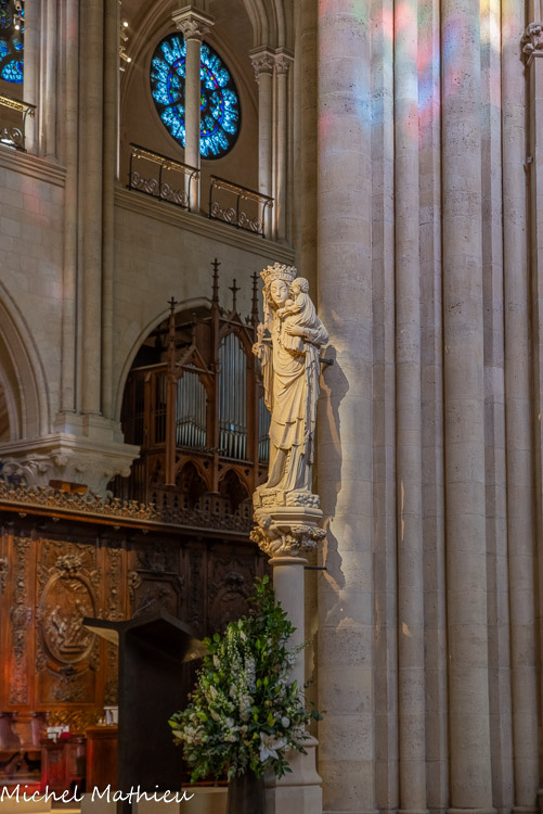 Au centre, une grande rose, dont le diamètre mesure presque 10 mètres, forme une auréole à la statue de la Vierge Marie qui est encadrée par deux anges et nous présente son enfant, Jésus, le Fils de Dieu.
