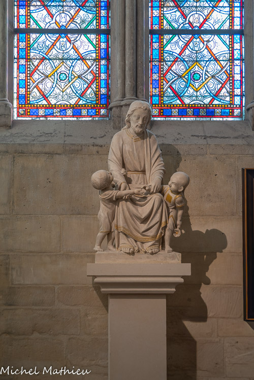 Groupe sculpté. L'Œuvre de la Sainte-Enfance. Victor Geoffroy-Dechaume, sculpteur, vers 1864. Vitrail en grisaille. Alfred Gérente, maître-verrier, 1865