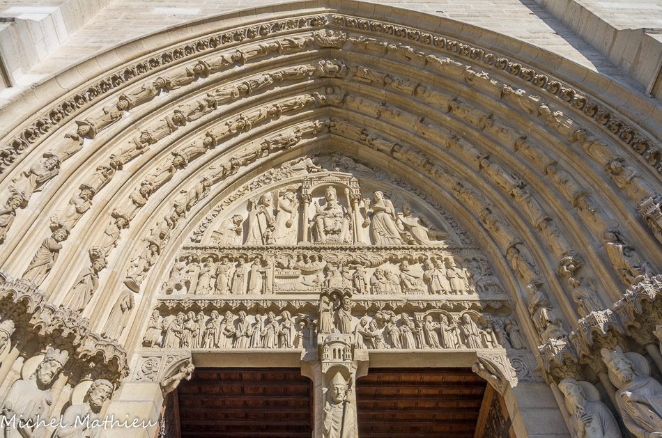 Son tympan est le remploi d’un tympan précédent fait une cinquantaine d’années plus tôt pour la cathédrale précédente (l’ancienne cathédrale Saint-Etienne). Dans les niches, les deux statues sont, à droite, saint Denis et à gauche, la Synagogue.