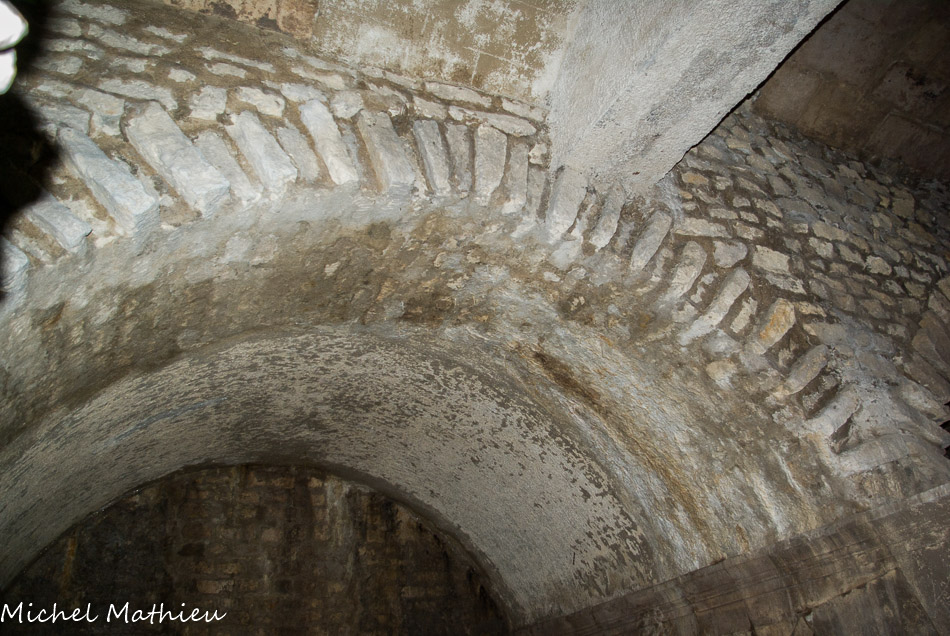 Claveaux de briques altrenant avec des claveaux de pierre dans une voûte d'arête de la galerie marchande du IVème siècle.