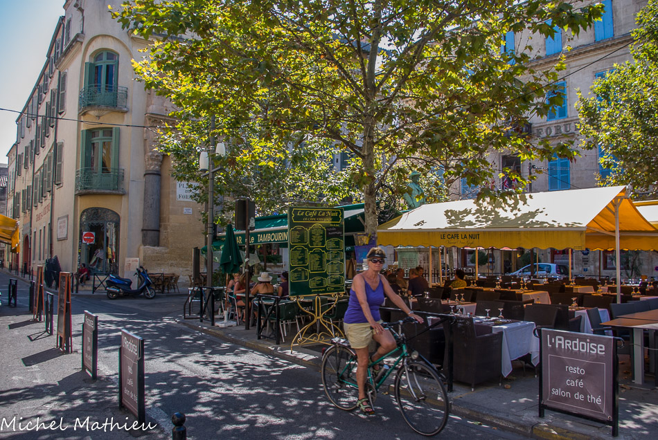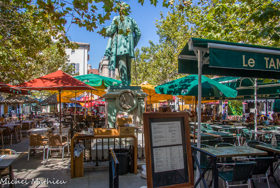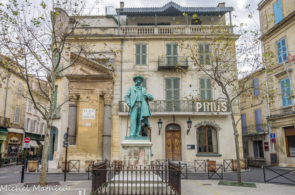 Hôtel Nord-Pinus et statue de Mistral, de Th Rivière, 1909, entourée d'une grille dont les barreaux sont en forme de trident des gardians (ficheiroun).
