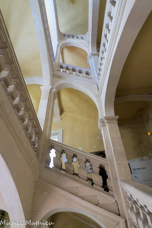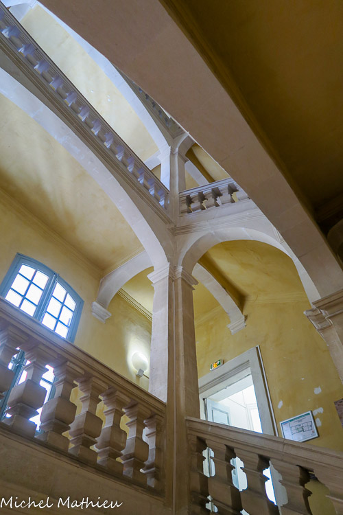 Cet escalier monumental, occupant tout le centre de l’immeuble, dessert quatre niveaux et comporte des volées droites à balustres, s’articulant sur quatre noyaux.