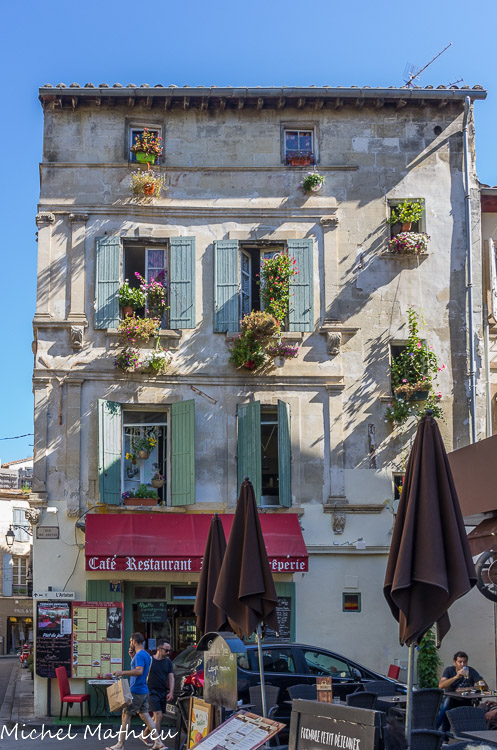 Au premier plan, la chapelle. Au fond, l'arrière de l'ancien palais Laval – Castellane (XVe siècle), aujourd'hui Muséon Arlaten.