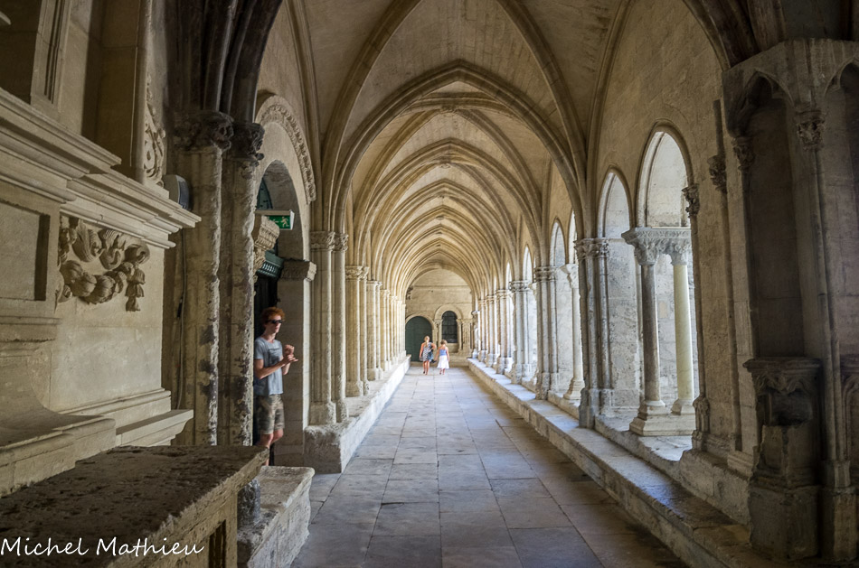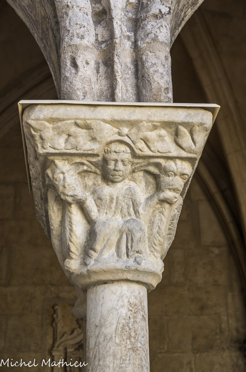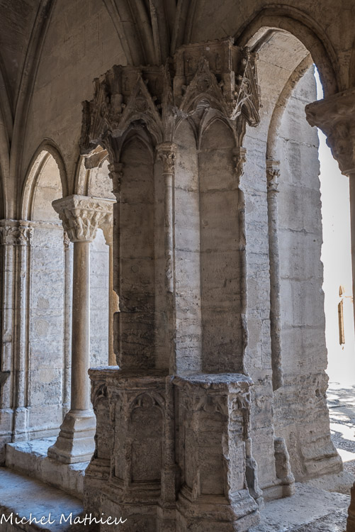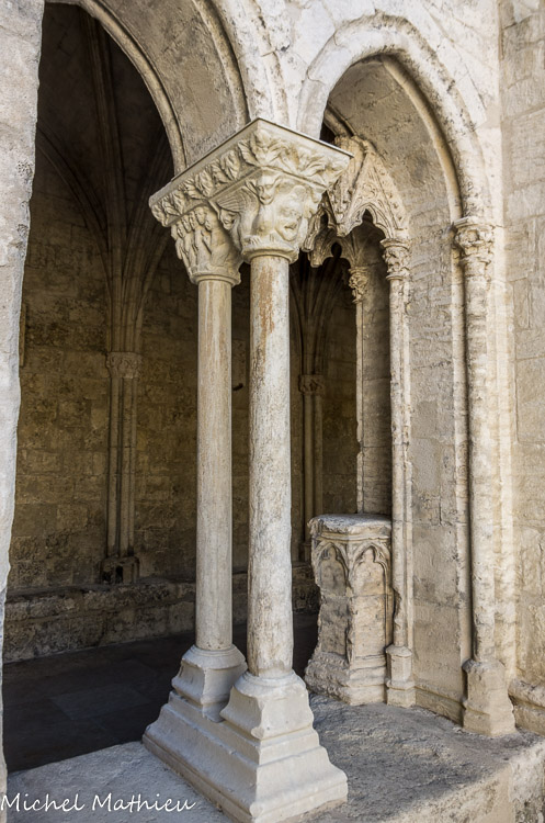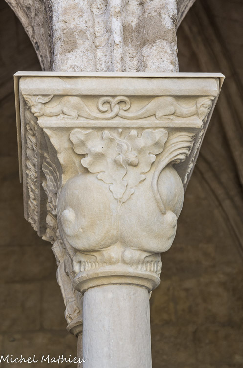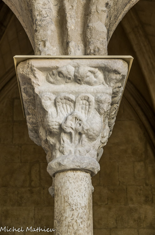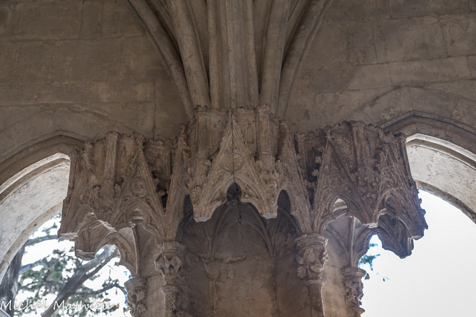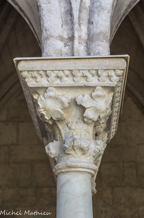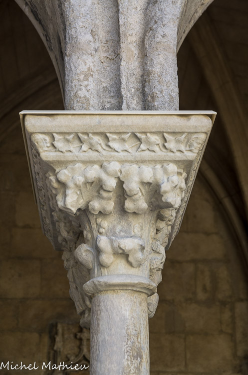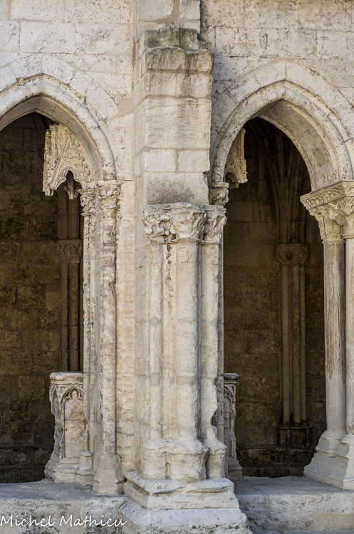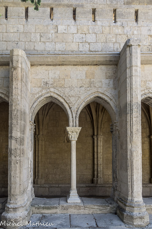 Galerie sud gothique. Les deux galeries gothiques ouvrent sur la cour par des arcades en arc brisé, groupées deux à deux, qui retombent sur des colonnes géminées, portant un chapiteau double taillés dans un même bloc. Les travées de la galerie Sud sont séparées par des piles alternativement minces ou renforcées