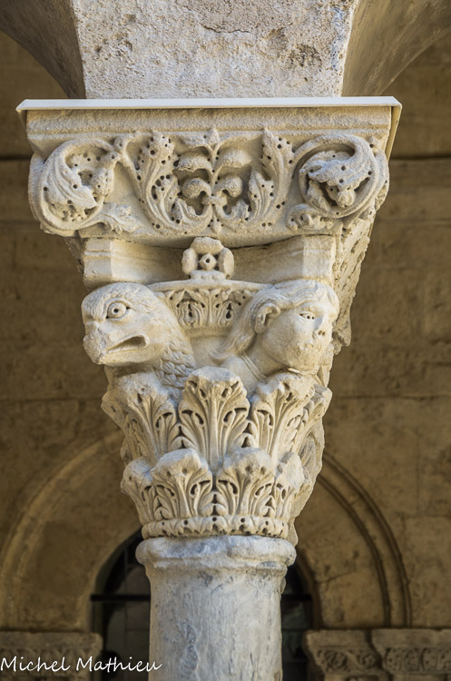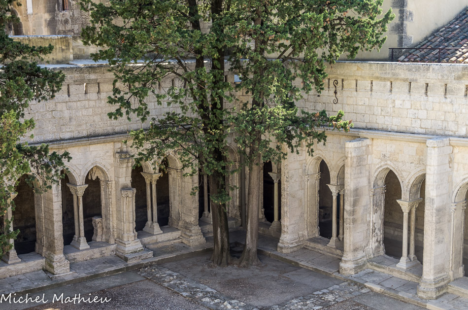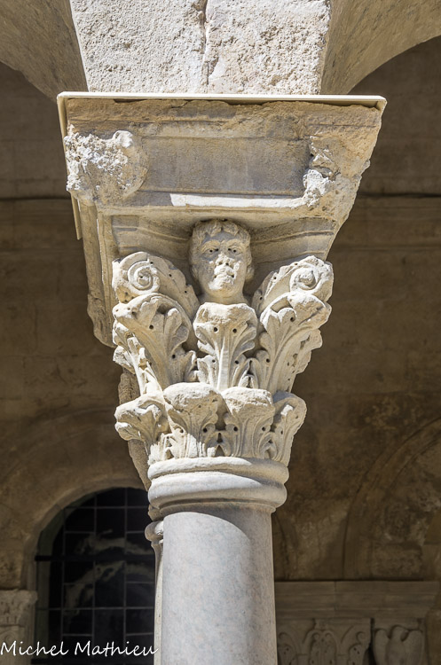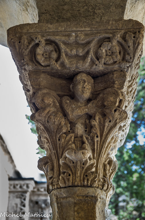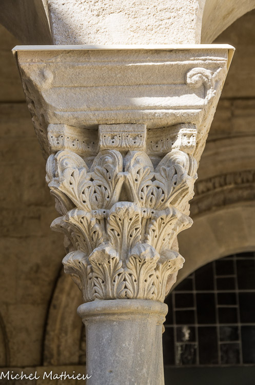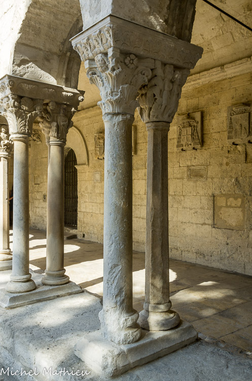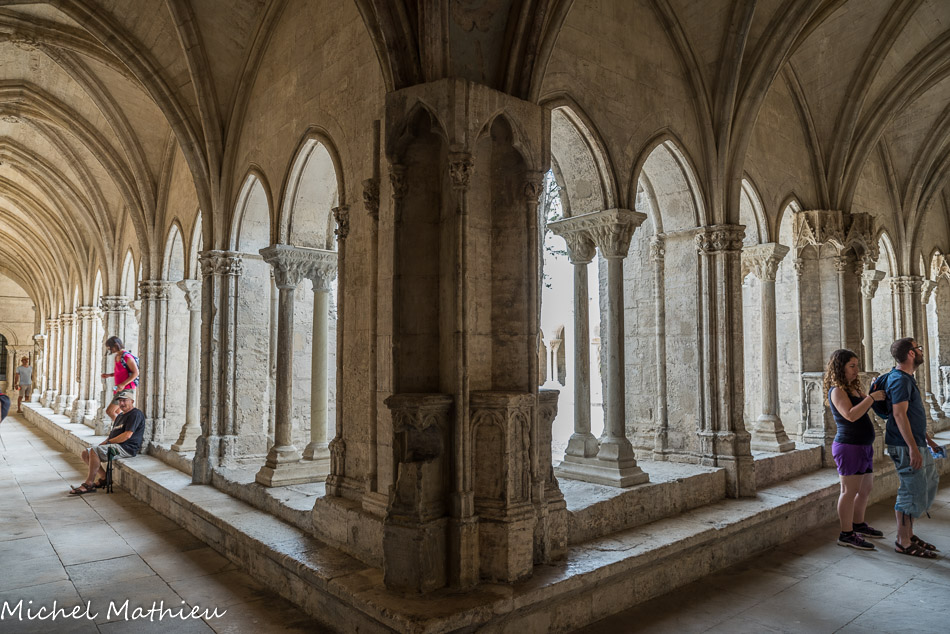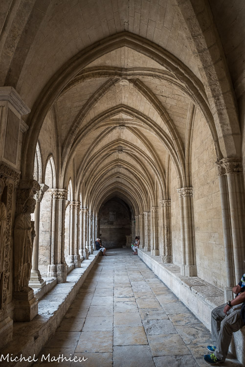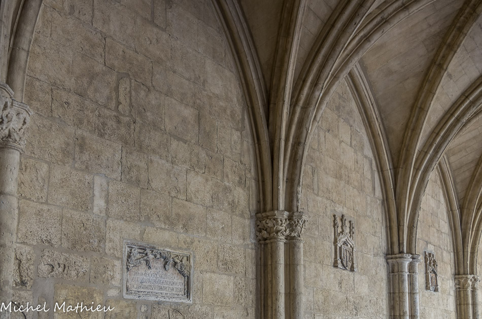 Galerie sud gothique. Les deux galeries gothiques ouvrent sur la cour par des arcades en arc brisé, groupées deux à deux, qui retombent sur des colonnes géminées, portant un chapiteau double taillés dans un même bloc. Les travées de la galerie Sud sont séparées par des piles alternativement minces ou renforcées