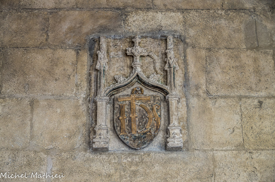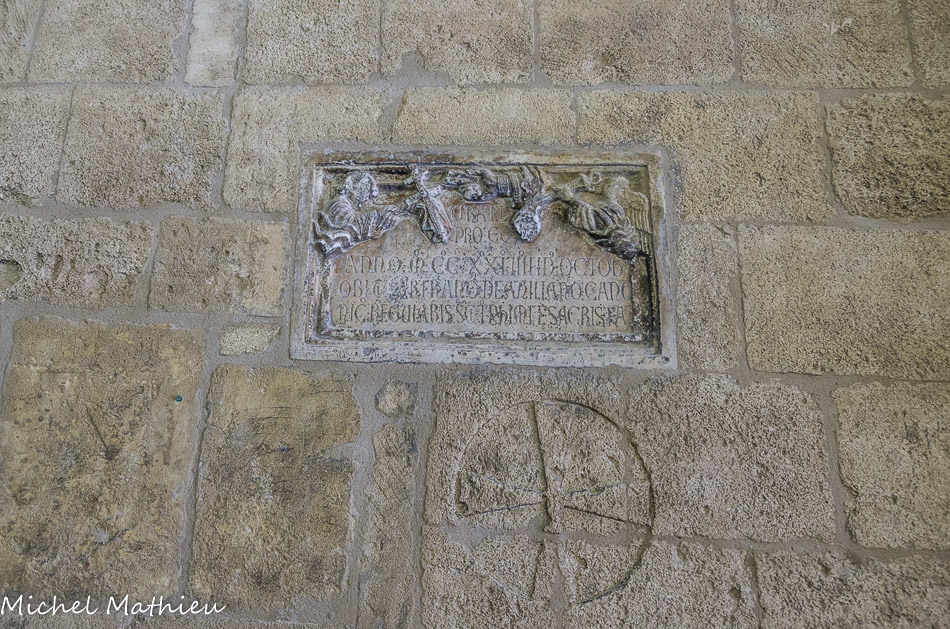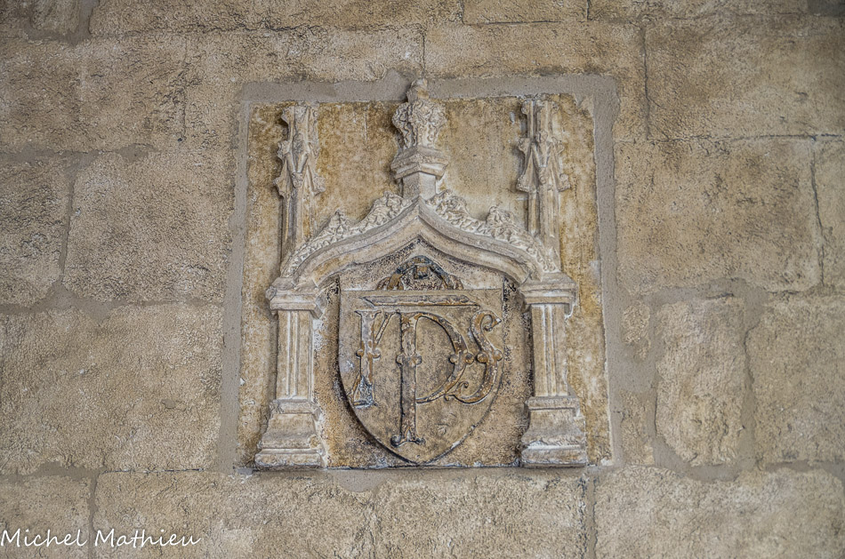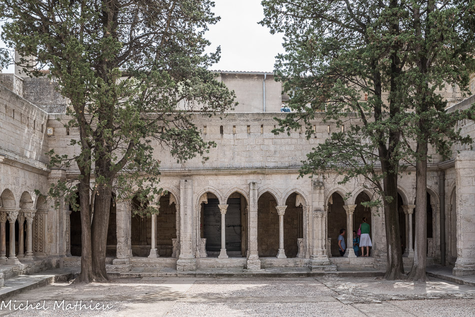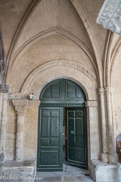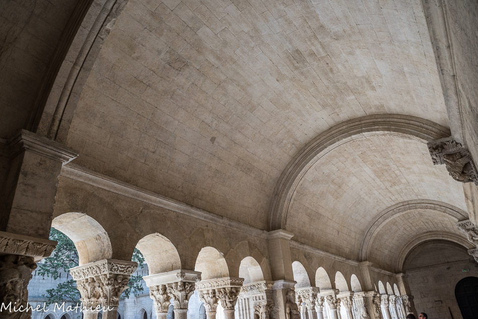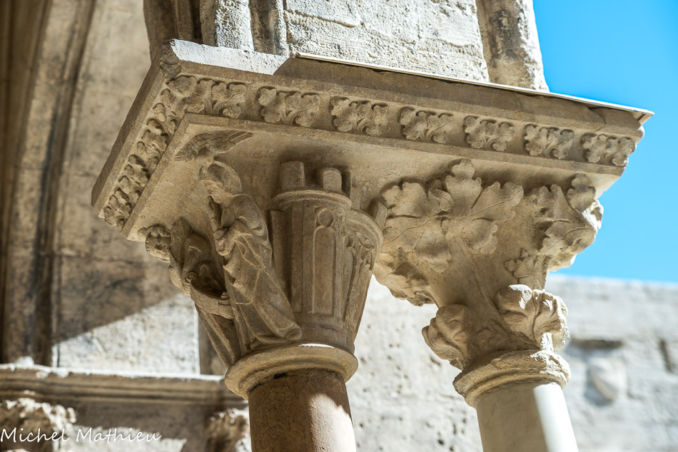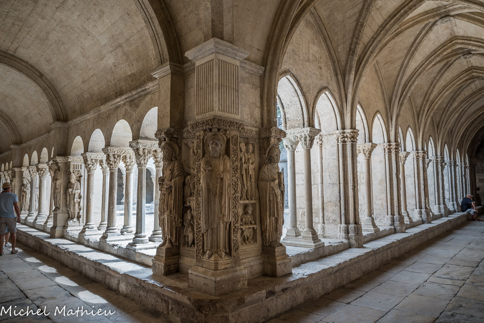 Galerie sud gothique. Les deux galeries gothiques ouvrent sur la cour par des arcades en arc brisé, groupées deux à deux, qui retombent sur des colonnes géminées, portant un chapiteau double taillés dans un même bloc. Les travées de la galerie Sud sont séparées par des piles alternativement minces ou renforcées