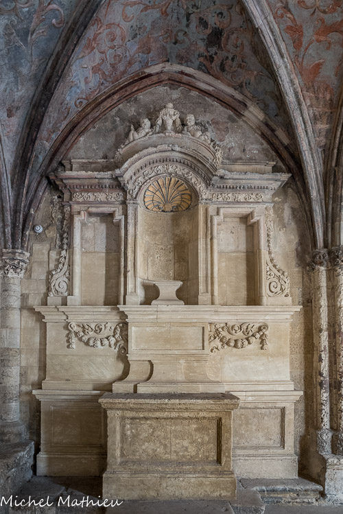 Les galeries gothiques sont voûtées sur croisées d'ogives dont les nervures s'amortissent sur des colonnettes ornées de chapiteaux à feuillage.
