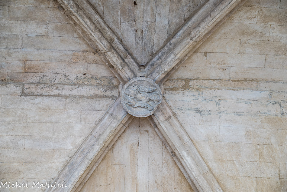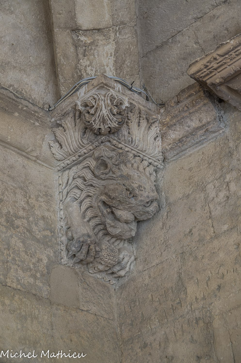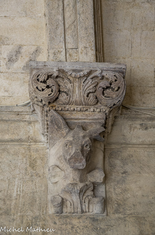 galerie Nord. Console représentant la tarasque, monstre androphage tenant entre ses pattes un personnage aux cheveux bouclés. Doubleau d'angle chanfreiné.