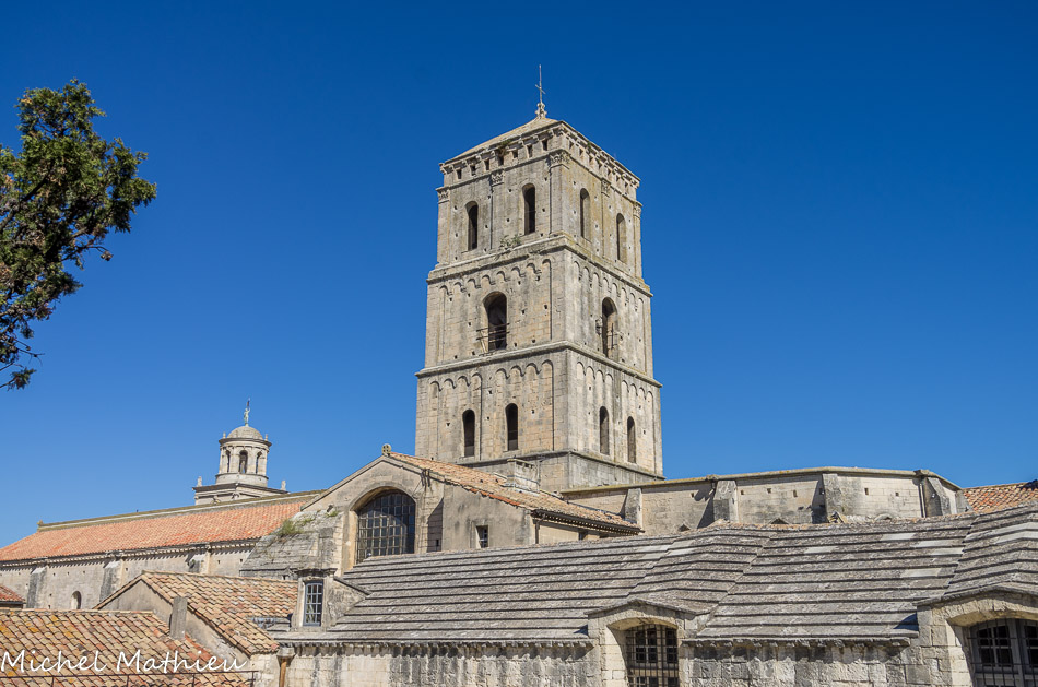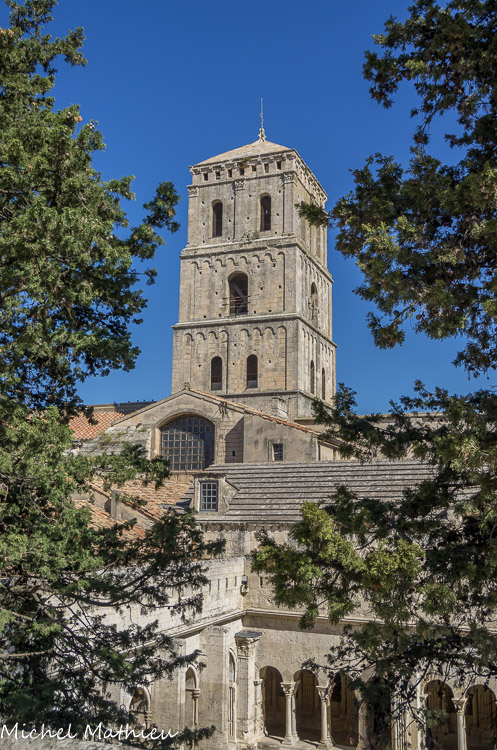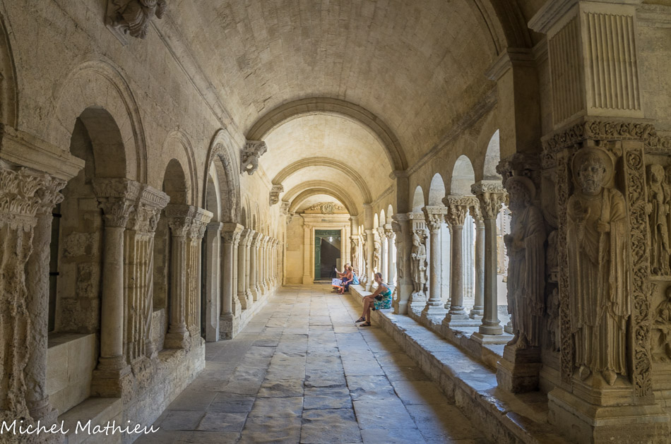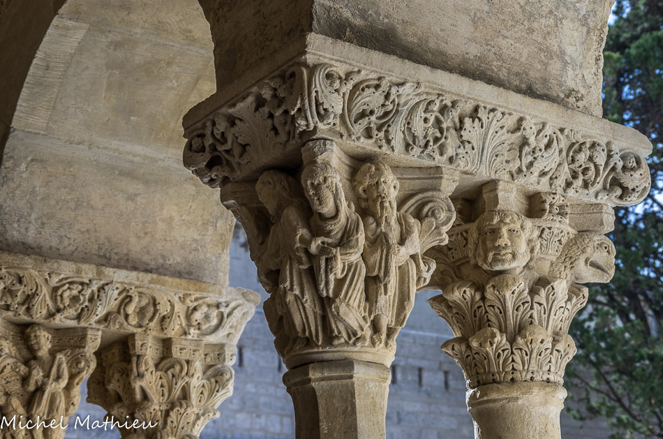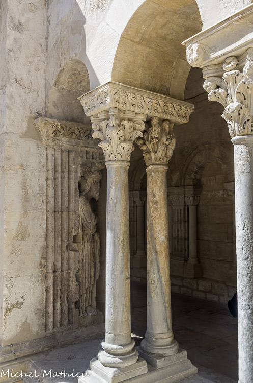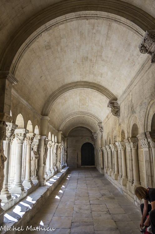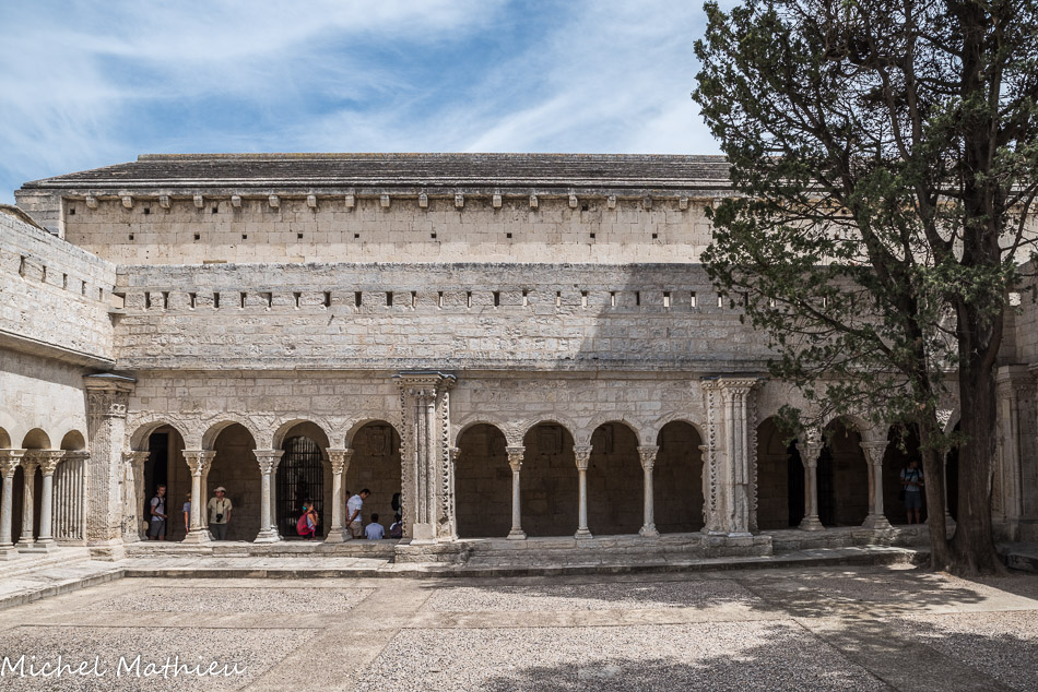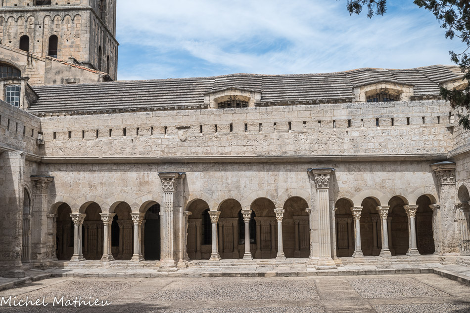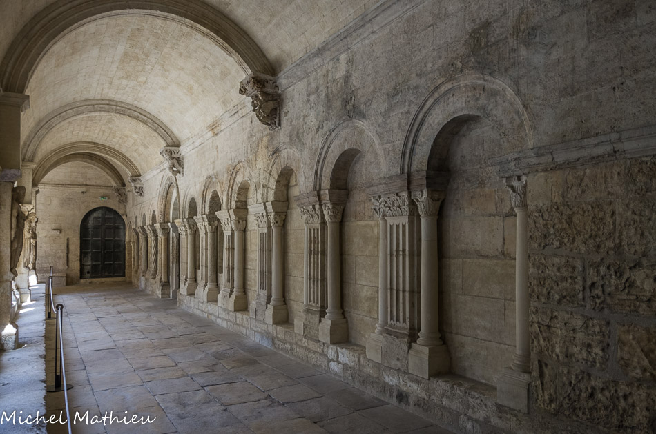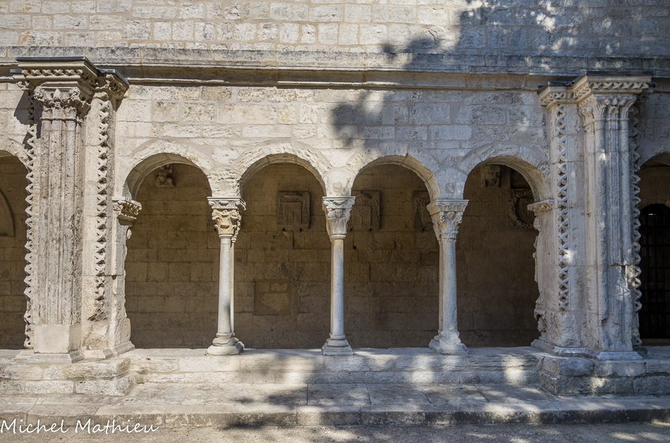La galerie Est romane. Chaque travée comporte quatre arcatures de plein cintre retombant sur des colonnettes jumelles rondes ou polygonales, portant des chapiteaux décorés sur leurs quatre faces. Leurs bases à deux tores inégaux reposent sur un petit mur bahut, flanqué d'une banquette.